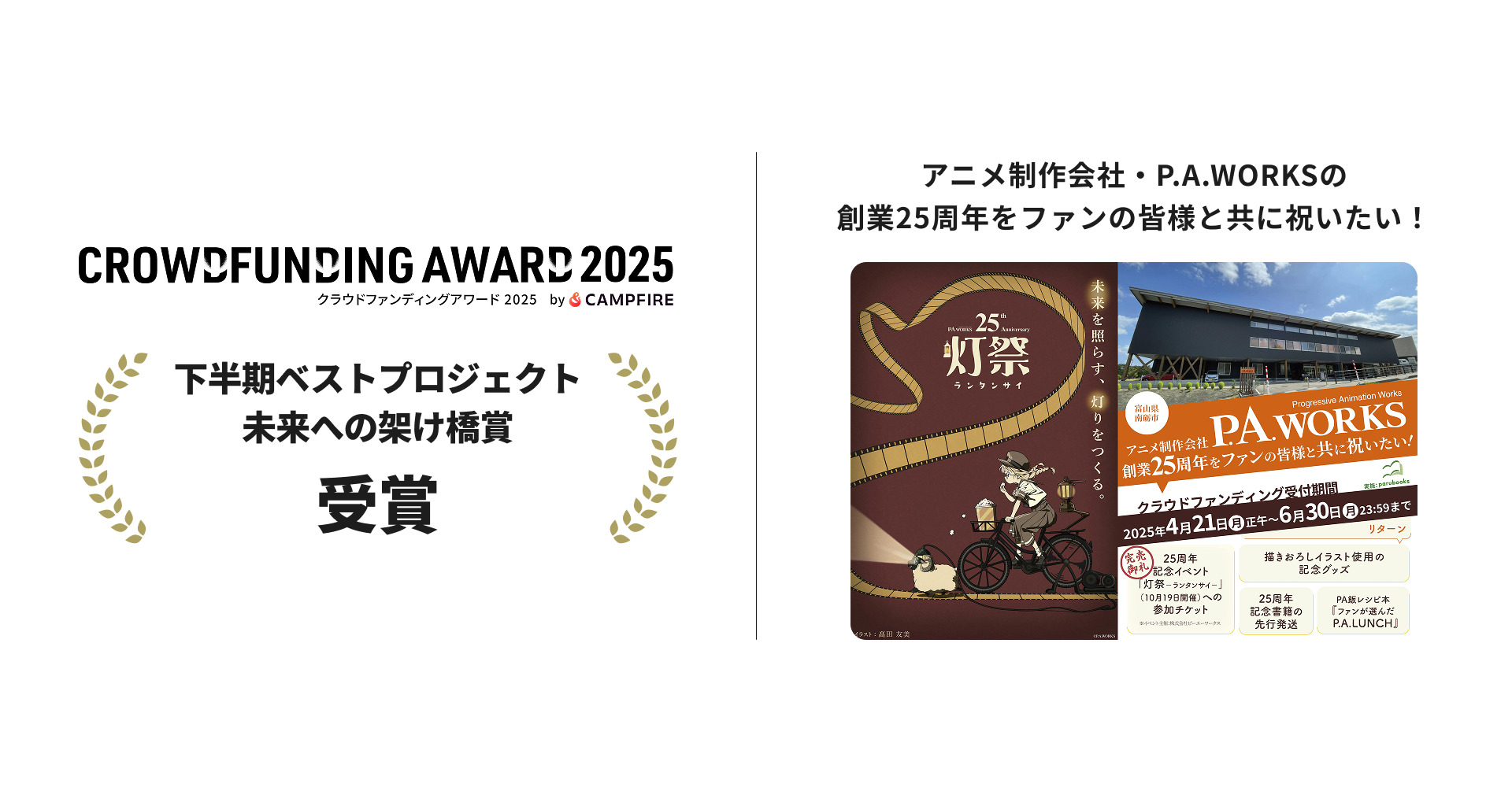 「アニメ制作会社・P.A.WORKSの創業25周年をファンの皆様と共に祝いたい!」は、富山県南砺市を拠点とするP.A.WORKSの25周年を記念し、ファンと共にその歩みを振り返り、未来への期待を高めることを目的に実施されたプロジェクトです。記念イベント「灯祭-ランタンサイ-」の開催を軸に、これまでの歴史や理念をまとめた書籍、関口可奈味描き下ろしによる記念グッズ、PA飯レシピ本など多彩なリターンを用意。リターンはファンがP.A.WORKSの“ものづくり”や地域との絆を体感し、スタジオのレガシーを共有できる内容に設計されました。今後も地域やファンと連携した企画・イベントを通じ、P.A.WORKSらしいアニメ制作とファンコミュニティの発展に取り組み続けていきます。